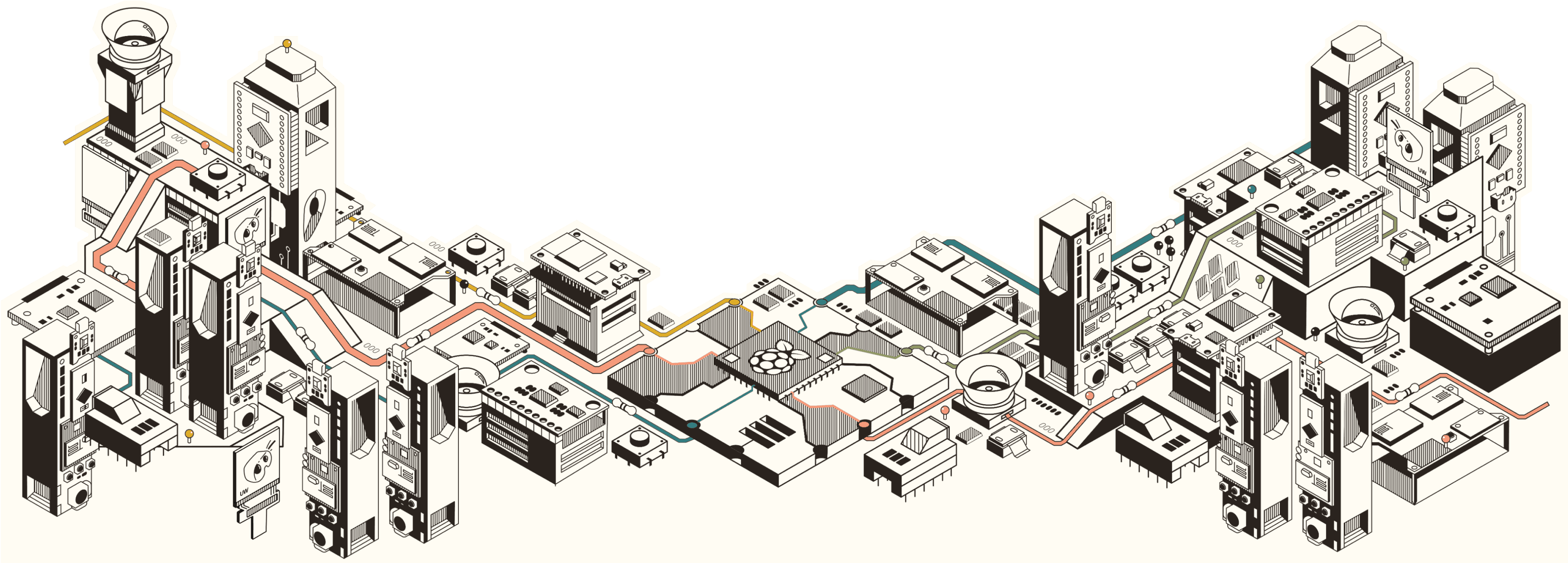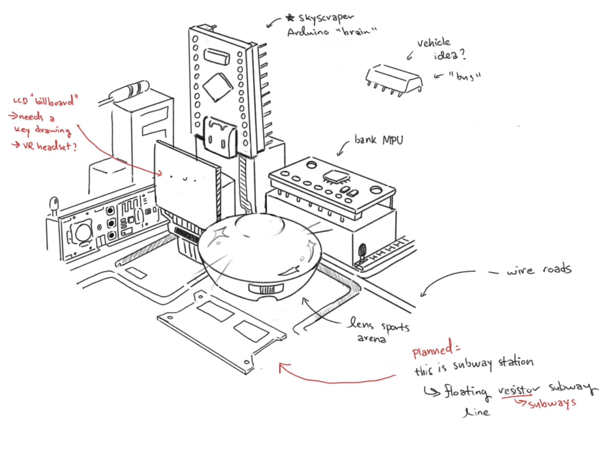 Throughout the ideation process, I was really inspired by how the circuit parts they used during VR/AR development looked, and wanted to incorporate them heavily throughout the design. One idea that came up was an idea of a “circuit city” where buildings could show how circuits come together to form a system.