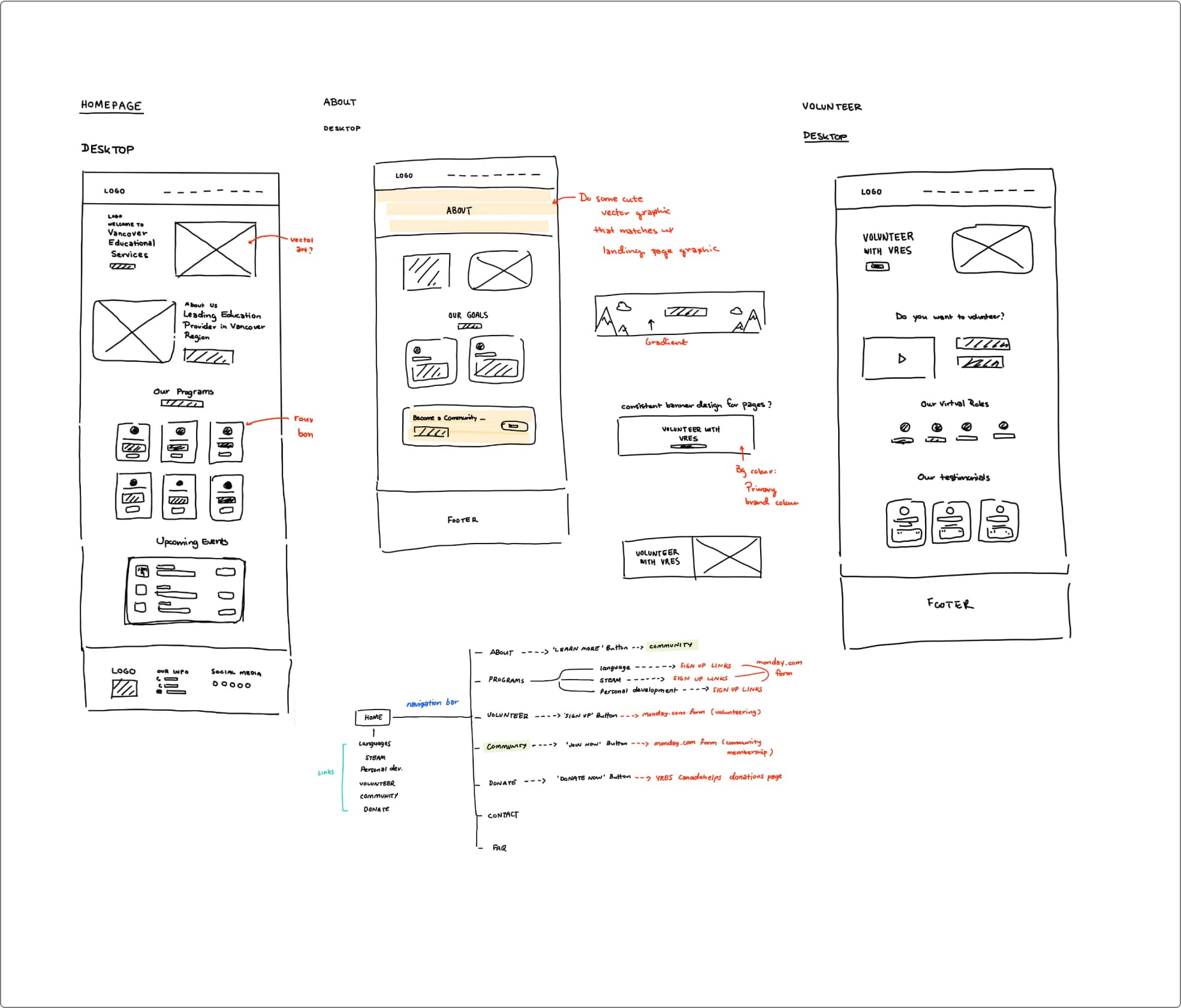 Following the requirements from the existing VRES website's design, I created low-fidelity sketches to determine which placements of elements would be the best.